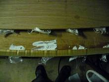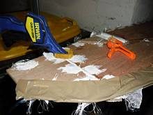 Now to join the centre. Because at this point there was a half inch gap between the two panels remaining to be joined I made my spacer out of three layers of cardboard about 15-20mm wide (¾ inch). This made them relatively easy to wrap in the bond breaking tape and to bend to the shallow curves that make up Die Foldermaus a thumb width's wide. This was so easy and controllable I was able to match the edge precisely and was a lot easier to handle than the rope. Cardboard is also easy to get. Where I live there is even a home delivery service for cardboard - it is a little expensive but they do include a free pizza! I finished up holding the cardboard in place with the packing tape so it did not slide around when attempting to stack the pieces.