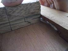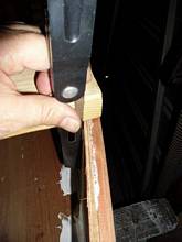 Draw a pencil line from underneath the piece of wood using the edge of the inside if the boat as your exact guide. Take a strait edge pressing it against the inside of the boat and draw that line up the thwart. This gives you the exact angles (bevel) you need to cut to match the side of the boat. If you are cocky like me you will then flip your piece of wood over, angle your hand saw according to both lines and cut a perfect matching bevel on both ends, or you could be sensible and have a practice run on a bit of scrap wood or two, or three.