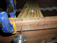Now drill some pilot holes for the dowels that will hold the thwart in place. After drilling the first of the holes insert a small nail to stop the thwart moving while you drill the rest of your pilot holes. At this point it might be a good idea to mark the thwarts with whether they are the back, front, left or right. Here I have marked this one PS - for Port Stern.