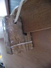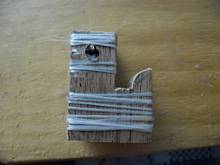 Then I cut the hook out. Part of the problem with wood is that it has a grain and it can split more easily along the grain than across it. As a result the wooden hook needs to be reinforced across the grain. Luckily fibreglass strands abounded in my workroom due to the fiddly nature of cutting 3 inch strips from cloth and when I ran out, picking a few inches off the end of the fibreglass ribbon provided a fibreglass thread that was quite long as the thread zigzags across the ribbon and unravels reasonably easily.