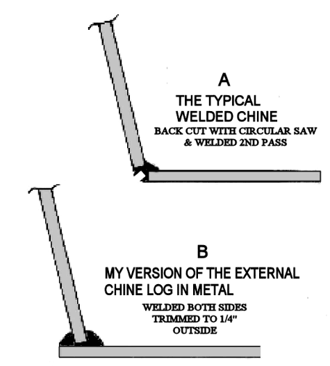 Welding aluminum joints generally calls for welding on one side first then, using a circular saw, back-cutting half way through the joint before welding the other side. I modified this procedure to imitate the way professional aluminum boat builders treat the bottom to transom joint. I am calling it my version of the external chine log. It only extends out ¼”. It’s not a new idea; David Beede shows this design chine work in his PL Premium experiments at https://www.simplicityboats.com/pl_premium.htm