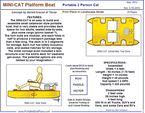 The PortableBoatPlans "2012 Portable Boat Design Contest" is over for another year, and there were two winners (tied votes). The object of the contest was simple: Develop a concept for a small homemade boat that would appeal to many other amateur builders. This year the co-winners both provided a design for a catamaran hull platform boat, with some unique differences. The MINI-CAT by Harold Krause of Texas, featured in this article, is about as basic as you can get, yet it has the potential to be much more. As drawn, it is a little less than 8 feet long and is 4 feet wide. It easily breaks down into four hull modules that are each one foot square by 4 feet long. The deck is composed of 2 sections, each 3 feet by 4 feet wide, and only 2 inches thick. Once assembled, the primary means of propulsion is with oars, or paddles, but a trolling motor is easily adapted to the boat for leisurely cruising, at around 4 MPH.