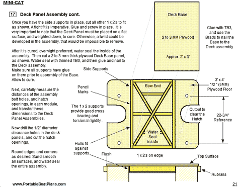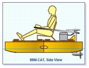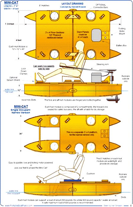 Page 1 of the plans give you a sense of what the MINI-CAT is, and what it can do. Because you sit ON, and not IN the boat, some getting used to will be expected. Perhaps you will want to add a small splash shield to the front of the deck panel, or a small canopy can be easily constructed to provide shade on those sunny days. The options are only as varied as your personal wants and needs.