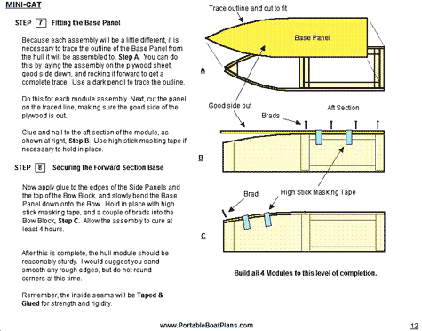 In the meantime, with the plans of the MINI-CAT complete, construction work should get underway this summer. The materials list consists of 2 sheets of 5 MM plywood, and 1 sheet of 1/2 inch plywood, in its basic form. Additional materials, like 1 x 2 lumber and TiteBond 3 waterproof wood glue complete the list. Because of the simplicity of the design, the plans consist of only 26 pages, including the Tape & Glue Process of joint sealing.