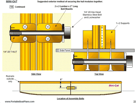 Everyone always wants to know how the whole thing is held together. The above sketch defines the Hull Module Assembly Bolt method of joining the hulls, for a secure yet easy to disassemble process. I have, over the years, tried other methods, but simple Stainless Bolts with fixed T-Nuts has proven to be the easiest to implement.