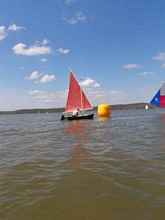 I was lucky enough to take Paul Helbert's sailing skin-on-frame Chuckanut 15 for a ride, and Eugene invited me to sail his Piccup Pram. Fortunately, the wind was light as I struggled to master the Chuckanut's fore and aft steering stick, but even so I had to remind myself to breathe now and then. It was a hoot! The Piccup was a delightful little boat. After the "majestic" tacking manners of my Zephyr, the Piccup's nimble turning ability was enough to make one dizzy. Thanks for the rides, fellas!