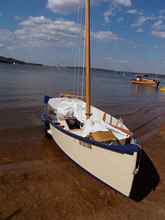 For a while the Rampant Goose did a fair job of keeping up with her more sophisticated sisters, but, as the wind eased up, we began to fall behind. My reefed lateen sail doesn't have a very efficient shape for upwind work. Shaking the reef out while underway looked like an opportunity for embarrassment, so we eased over to the nearest beach and unleashed 81 square feet of determined Dacron.