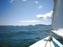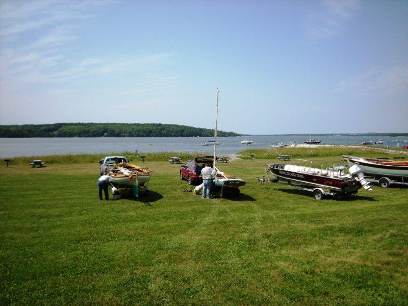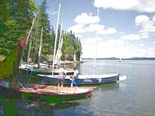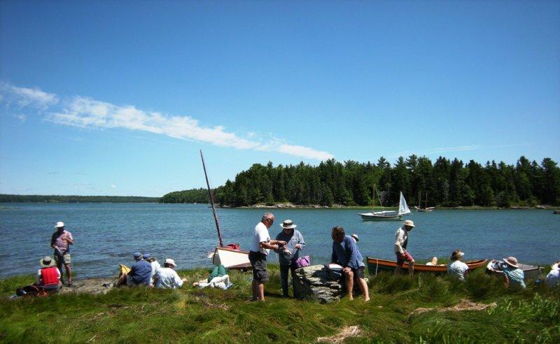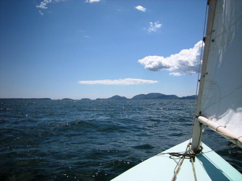 Thursday began with getting all 49 of the boats launched, which was accomplished in a little over an hour! We then set sail for Thomas Island, about 5 miles away. The wind started out at about 5 knots, but continued to build throughout the day to 10-15. We all experienced a lot of spray and occasional water over the rail. As crew, I tried to shield the skipper from the spray, ending up quite soaked, but smiling as we clipped along under a full blue sky. We took a break on Thomas Island for lunch and then headed back to Lamoine with most boats choosing to reef.