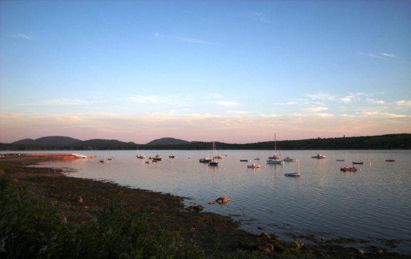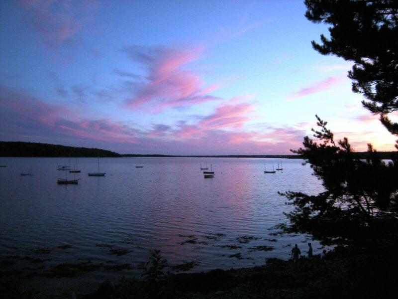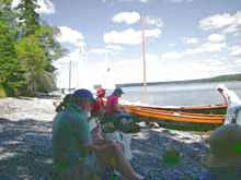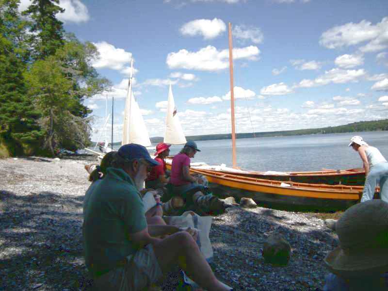 Friday started out with a good wind from the NW, but that died late morning and we all had to resort to oars. We made Stave Island for lunch and as we finished a nice sea breeze began to pick up at about 5-10. Heading back towards Lamoine across Frenchman's Bay, the wind died just as we began to fight the incoming tide. We picked up a welcome tow from a chase boat for a mile or so, and then the wind again picked up. We dropped the tow and hoisted sail. The wind took us most of the way back to Lamoine, when it again went still. We finished our way into Lamoine under oar power. Along the way, I saw several small crabs hitching a ride on floating Kelp and seaweed. Life in the ocean looked very vibrant and strangely similar to their sailing human counterparts.