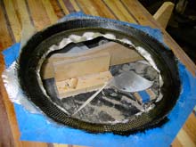 The next step involves filling any voids with epoxy and filler and setting a small fillet around the inside corner of the wood ring and the walls of the riser so the glass and carbon will lay in nicely. Let it cure, sand it fair and lay in a layer of 4 oz glass, a layer of carbon, and another layer of glass to protect the carbon when the entire recess is sanded fair.