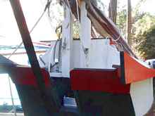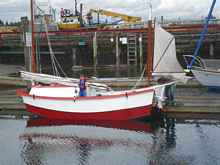 Now I just had to wait for better weather and it came in April however the social secretary had decided that we needed a holiday and that driving down to Palm Desert and back would be just the ticket so April was out. May came but I was on call for most of it so not able to launch any boats. I had a window of opportunity at the end of May and took advantage of it and on 29 May 12 into the oggy she went. That's my favourite small sailor directing operations from amidships. She came off the trailer with no problems and settle right to her lines as drawn.