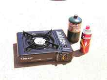 There are hundreds of small single burner backpacker style propane fueled stoves on the market. Most are very easy to use for the most part. A propane cartridge is attached to the stove, either directly or by means of a connecting hose. A burner valve is turned on and the fumes are lit with a match or a piezoelectric self-ignition.