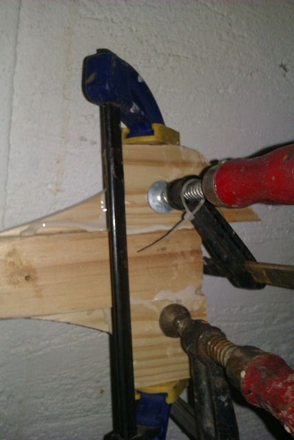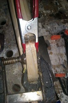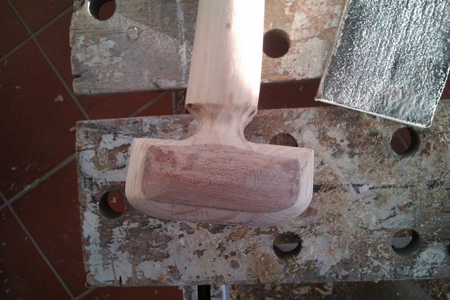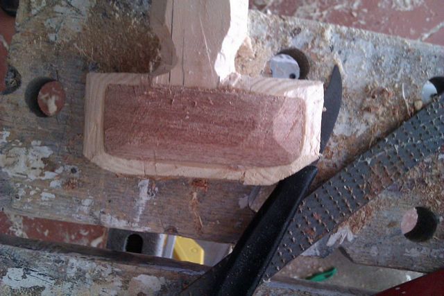 I rebate planed out some of the original wood so I could laminate in some wood in with the grain in the strong direction. Note the potato peeler that I was using as a finishing spoke shave on the shaft and the Victorinox shaping knife I bought at a kitchenware store.