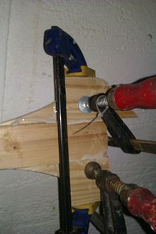 STOP. Don't glue together now like I did – remember to seal the inside surfaces of the sound chamber as getting a brush in there afterwards is nigh on  impossible. Then glue together (note the nail stopping things from sliding around). After gluing together finish off the shaping of the blade. The small hole is where the strings feed through to be tied to a short piece of a thick bamboo BBQ skewer. The strings will be held in alignment on the bridge by notches.