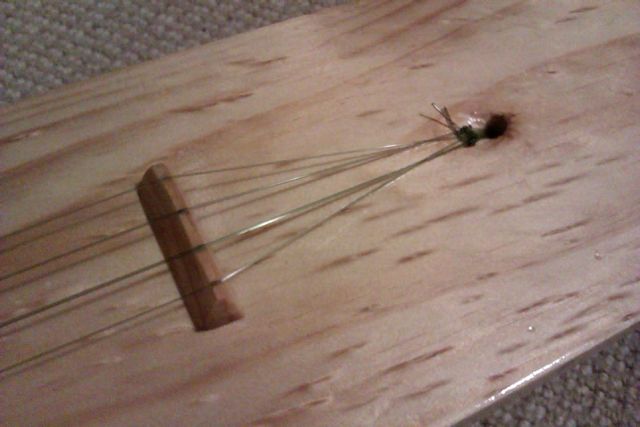 Because the bridge is a floating style, just held in place by the pressure of the strings, it can be played with for optimisation without bothering much else. This one is a simple 10mm pine triangle with notches 12mm apart. When you are happy with how it plays and sounds make a couple of marks where the bridge is so you know where to put it back when someone knocks it out of place.