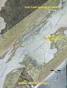 When he got back, we discussed whether we wanted to set up the tents for the night. We both decided that there were no good camping spots on the beach and so we decided that we would spend the night on the boat. Without tents to pack up in the morning we felt we could get an early start for our last days sail in the morning. Bill decided to take my sleeping spot on the bow. I unstrapped the bed boards I had made from the stern of the boat. The boards when set up provide a sleeping platform between the centerboard trunk and cockpit seats. Between the seats and the boards a suitable area was available for me to sleep on.