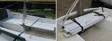 2x4's with 1x4's to reduce weight. With the legs folding to the outside I could tie a line between the legs to lock them in place. For this years' event I had planned to use a tent and sleep on shore, but wanted to carry the boards just in case I wanted to sleep on the boat. Last year the boards were stored in the cockpit while under sail. This year I decided to store the boards in the stern with straps. I added strap attachment points in the stern on each seat. I placed the boards across the seats in the stern creating a rear deck area similar to a Day Sailer I. On one of the boards I place four screws with wing nuts to the underside. These screws would face up when the boards were folded. I attached a 5W solar panel to the boards. This panel went to a rechargeable battery pack (secured below the boards), which was connected to a small electric cooler. The panel itself could not power the cooler, but running through the battery it ran very well. We did not use the cooler much as planned however. The panel was used for recharging the VHF radio. As a further refinement of the bed boards, I plan to make two separate boards, the length of which will be equal to the width (about 4-feet) of the cockpit in the stern. The legs will fold the same as current modification. With two separate boards I can have sleeping surfaces on each side of the centerboard trunk. I can get enough extra length by using the rowing seat up against the cuddy cabin.