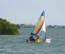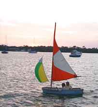 Nesting V-10 dink with salvaged windsurfer rig. |