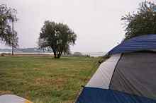 Awake in the middle of the morning, we discovered that our tents weren't entirely waterproof - little puddles were dealt with using drinking cups and a washcloth. I went out in the light rain to put up the free- standing umbrella and folding chairs I'd cleverly stuffed in the cabin. If I arranged it right and the wind didn't shift, I could keep one chair mostly out of the rain and a second about half out of it. If I needed a good stretch, this would be the place. Breakfast was granola, oatmeal and coffee without sugar (forgotten on the boat). After eating, we went to check out another possible shelter: a little house built on the dock optimistically equipped with some dozen or so bench seats for tourists waiting for water taxi or ferry. It would be an adequate book nook, and came with a view of nearby Hull and the bay we'd sailed across yesterday.