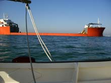 Having no motor and not wanting to dawdle in the foggy ship channel, we accepted Stan’s offer of  a tow out of Bahia Marina and across the La Quinta and Corpus Christi ship channels (Ingleside lies near the intersection). As we approached the channel we could hear a fog horn and the rumbling of a large diesel in the distance to starboard, but could see nothing in the fog. We had visibility of something less than a half mile& so we crossed the channel as a group, blasting our horns and announcing our presence and intentions on Vhf Channel 16. Some minutes after our noisy dart across the channels, as we lay hove-to discussing our route across C.C. bay, the dark shape of a barge emerged briefly from the fog only to disappear just as quickly back into the swirling mist as it made its way out the C.C. ship channel toward Port Aransas and beyond. Stan cast off our painter and the 3 little boats& began their slow tack in light winds through the gradually thinning fog. Major, having given orders to be wakened at any sign of trouble or dog snacks, settled down for a nap, staying fairly warm up near the mast in his dog sweater and life jacket. I won't say he was happy about it, I can only say he was resigned to it.