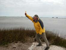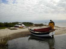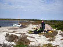A cool front arrived overnight bringing some light showers, more fog and a blustery north wind. The fog disappeared fairly early and we found Corpus Christi Bay to be a sea of white caps. Chris obtained readings of 22-25 knots with gusts of 28 on his wind indicator, though it had blown much harder at times through the night. We discovered that the little beach we were on, showing on the chart to be a small island lying within a cove of Shamrock Island, had actually filled in to become part of the main island. I'm glad that we chose, in the darkness, to wade the boat around in a clockwise direction as going in a counter-clockwise direction would have yielded much less satisfactory results! As it was, our little cove afforded us excellent protection from both wind and waves.  We contacted Stan by radio and learned that their campsite was about 2 miles East of us on Mustang Island and about a half mile North of the anchored sailboat we had seen as we came in. It had become a lee shore overnight and apparently they were having quite a time as Pehr's boat was bashing about in the wind and waves. Stan had dragged his boat ashore the night before and it was now high and dry as a result of low tide combined with the effect of the north wind pushing water out of the bay.