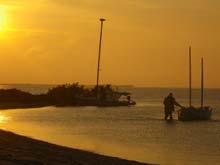 Stan arrived just before noon after a frolicsome trip under motor down the coast and we agreed that we should wait for the wind to diminish as predicted and then sail back to Ingleside rather than head South to Snoopy's. We both got out snacks to share and sat on the beach behind some mangroves where it was quite warm. I made Poor Man's Paté (1 can vienna sausage, a spoonful of mayo, mash it all up real good, top with a squeeze of sweet pickle relish), opened a can of tropical fruit, and brought out the Tillamook cheese. Stan had corn nuts, beef jerky (Major loved Stan), fig newtons, and crackers. It was nice to sit around in the warm sun, sharing snacks and conversation. A roseate spoonbill arrived to fish the cove. Around 1:00, it looked like most of the white caps were gone and Otter and Spartan sailed back to Ingleside together, shaking out our reefed sails after the first hour. Of course, the wind diminished to almost nothing by the time we got to the Bahia Marina entrance and Chris had to row the last hundred yards.