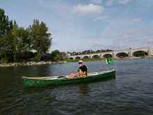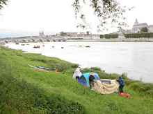 Day four had us passing through the town of Tours at midday. After negotiating a couple of dodgy rapids, one of which Mik and I comically managed to exit stern first before running sharply aground on a large rock, we enjoyed a second brief, but less jarring, stop for lunch. Unfortunately, most French business, including restaurants, typically close for several hours in the afternoon for "lunch", often not opening again until 3 or 4 p. m. in the afternoon. Once again, our paddling lifestyle was predictably out-of-sync with the rhythms of French culture and most of the restaurants we found were closed. At last, we stumbled upon a reasonably priced kebab shop in a student sector of town to satisfy our appetites before enjoying a brief walking tour of the streets of Tours on the way back to the boats. The day ended at a roadside boat ramp West of Luynes which had little to recommend it other than a picnic table at which we were able to prepare our evening meal of veggies, lentils and bread (always more bread!) and sit and eat like civilized folk. Having been told by the local fishermen that Luynes had little to recommend it, we all soon bunked down for the night to be lulled to sleep by traffic noises from the nearby freeway.
