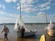 George's trip to Sail Oklahoma was the first time he launched the boat since building it. So I had to wait for George to make a couple of shakedown sails before I got to take a ride on Muritai. We didn't really go all that far, but I loved every second of it. I'm not sure what the capacity of the Houdini is supposed to be, but with three of us on the boat it felt like the boat hardly noticed we were there. Being a catboat with a fairly wide beam, the Houdini may not be as fast as some other boats, but it sure felt fast while we were slicing through the waves. George may have thought I was nervous because I shifted to the other side of the boat several times when we changed tack and it heeled over. The boat came upright after I shifted over. I was assuming that was because George made some adjustments at the helm, but I don't know. A friend of mine had instructed me to shift to the other side whenever I changed tack in my puddle duck, of course my little puddle duck is a lot more sensitive to where you are in the boat. For some reason when Muritai was heeled over and my face was so close to the water, I had a really strong urge to just stick my hand down into the water and feel it flowing over my fingers. I resisted the urge, but I really enjoyed that feeling with the boat being heeled over and so close to the water.