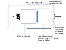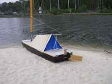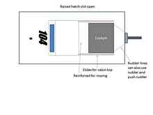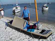 A rear cabin also gives some advantages when sleeping in the evening especially if the 5 foot or so in front of the cabin is open. You can simply slip your body forward and down to sleep with your feet tucked under the front deck and your trunk and head in the higher headroom rear cabin area. Probably the best-known historical boats to use this method were the Barnegat Bay Sneakbox which were designed for multiday hunting trips. In fact, I was inspired by this design enough to make a similar boat using Gavin's flying rat as a platform. I called this 12' boat Queequeg's Coffin after the coffin used as a lifeboat in the literary masterpiece Moby Dick. Besides, the boat sort of did resemble a coffin when I was through with it. I used this boat for the 2010 Florida 120 but found the leeboard to be undersized for coastal sailing especially when confronted with tall chop in light winds. The chop would slow the boat to the point that the leeboard didn't have any bite and the boat would slip to leeward making no progress towards the goal. Still, the sleeping accommodates, while spartan, were comfortable and easy to set up. I also tried and loved a tiller rope setup where lines came off the rudder yolk and went around the inside of the cockpit through a series of pulleys. Not only did this steering setup avoid the embarrassing "dropping of the push pull tiller pole" but it also made the helm somewhat self