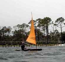 Unfortunately, I couldn't reef this sail which made things exciting at times. Another rig option I had in my workshop was a very interesting leg-of-mutton rig off of an Escape brand sailboat. What makes this rig unique is the ability to roll up the sail around the mast allowing you to dial in any amount of sail you needed for the wind conditions. This ability was given by a special ball bearing collar around the foot of the mast along with a deck rather than mast mounted boom. The boom has the added advantage of being self-vanging meaning it doesn't kick up in the wind changing the shape of the sail which negatively impacting performance. This was the sail I used in Queequeg's Coffin during the 2010 Florida 120 and you will already have seen it in the photo of that boat sailing above. Though it too has a long luff, this escape rig isn't as good at sailing to windward as the windsurfer rig in my experience. I think it has something to do with the shape of the sail and the straight luff all to accommodate being rolled around the mast rather than optimum performance. Still, it should be closer winded than a four sided sail and the ability to easily roller-reef the sail is a definitely plus when it comes to seaworthiness of the boat. It also is a bigger sail which should push the more heavily laden EC PDR nicely even in light winds. So, I had my rig and it is bright orange which has some advantages for safety as well.