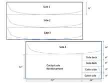 I also spent some time contemplating both the height of the sides of the EC PDR as well as the location of the built in floatation. The class rules for PDR racers restrict the bottom 10 inch of the hull to set dimensions. You can build a duck with 10 inch sides if you want to but be prepared to get wet which is not a pleasant or safe prospect for a going 300 miles on the water in March. However, higher sides translate into more weight and greater windage both of which have a detrimental impact on performance. Part of the reason I was so fast at the 2011 PDR worlds were the low 12 inch high sides on my duck along with its light weight. So, I was faced with a Goldilocks dilemma seeking that just right compromise between comfort and safety with high sides and performance with low. In the end, cut diagrams dictated 16 inch high sides being the best dimensions to get out of a standard sheet of plywood. As for floatation, I have been a fan of side airboxes for PDRs since my first duck. Eight inch airboxes allows the boat to float nicely on its side and come upright without any water in the cockpit. In fact, on my last duck it was quicker to tip the boat over to get the water out of the cockpit than to deal with a bucket and sponge. So, side airboxes with limited access. Floatation is sacrosanct and shouldn't be compromised for storage.