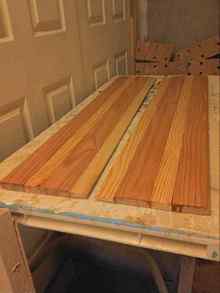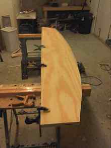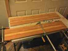 I didn't have suitable leeboards sitting around the shop but I did have some oak and poplar 1x boards so I decided to make the leeboards butcher block style with alternating wood types. I epoxied the wood together and ended up with boards 42 inches long by 9 inches wide. Once the epoxy had cured, I went after them with a belt sander until I got a nice foil shape. I drilled holes for the bolt and the line to raise the board. To keep it down, I rigged some shock cord and make the tension adjustable by using horned cleats on the boat.