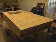 Next step was to glue and screw the deck on the boat. I used 1/4 inch plywood everywhere but the side decks by the cockpit opening. I used 3/8 ply there since I knew I wanted to hike out and give a stronger ply to attach oarlocks to. I know from experience how much stress my body parked on the rails and bouncing on the waves can put on sidedecks of a boat and I wanted no flex fatigue on this boat! Having played the guessing game of: where is that support I need to screw the deck into? - which I firmly believe is the origins of the battleship peg game, I went ahead and marked where each of the support beams I needed to put screws into were. I then used PL premium on all of them before lowering the deck into place. Once the deck was on, I cut out the opening for the forward hatch and mast by first drilling a hole then using my router with a flush laminate trimmer attached. Once all the glue dried, the boat was extremely solid with no flex.