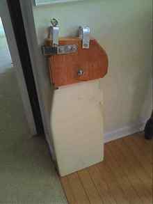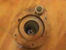 Mast step with the locking ring glued and screwed into place. Note the bolt at the bottom of the step that will go into a hole on the bottom of the mast. All the lateral forces on the mast are taken by the bolt and the plywood ring. The PVC sleeve is there only to keep out water. Note also the smaller PVC pipe making the step for the unique boom.