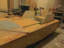 Next, I put the sides of the airtanks in and tacked them in place with nails through the bow and transom. I did not stitch those pieces to the bottom as the wire would have gotten in the way of the extra piece of plywood I was putting on the cockpit sole for reinforcement. I lowered this extra reinforcement in place and put some bits of wood in the airtank to keep the inner sides from shifting. I then laid the deck in place and stood back to take a look. I had built.... a BOX! I is at this point I posted looking for advice on how to add a few more curves for aesthetics but ultimately decided to keep it simple.