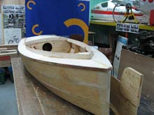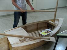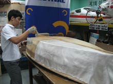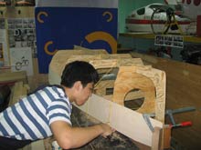The centerboard was just like a simple wooden plate. We cut the thick plywood into shape and just spread varnish on it. We put fiber-glass on all sides of the body to strengthen and waterproof it, but later we found out that this work had made her much heavier.