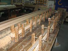 For the mast, we used some pine timber which had been in our garage for twenty years. We put three pieces together and glued them with epoxy. The combination of the three parts was way stronger and it was less likely to be bent. The gaff and boom were made in a similar way.