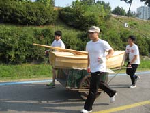 Meanwhile, we approximated the size of the sail using only the boom, gaff, mast and a friends’ hands. With that approximate measurement, I went to the biggest textile market in Seoul: Dong-dae-mun market which is located at the east gate of medieval Seoul. I told the seller the size of the sail and I chose the material with which he would make the sail. When the tailoring was finished I brought it to the school to check and see if it fit. Since the size given to the tailor was calculated just by approximate measurement, we found a few wrong sections. We marked those sections and I took it back to the textile store. After that, the sail was quite perfect.