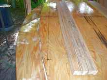 The slats were made from yellow pine. They were cut out with the 15 degree angle on both sides leaving them a full 1 ½ inches wide in the center. The bottom of the boat is ¾ inch thick so I just used deck screws and titebond III glue and screwed them one on top of the other. I cut the leading and trailing edge off at 45 degrees. Rounded over the edges and epoxy glassed them onto the boat. I figured if the whole thing didn't work out, I'd just get the saws all out and start over with the leeboard.