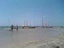 I had done some retaping on the luff of the sail on Wednesday, but that tape had started to come off after just 2 days, and today I was having trouble getting tape to stick at all to the damp, salt covered tarp where it was pulling away from the rope that was taped into the luff seam. After thinking it over for a few minutes, I opened the rear hatch and pulled out the grommet box, a small piece of scrap tarp material, and a short piece of scrap ¼” line along with the sewing supplies and palm. A couple of inches inboard of the tear I sewed 2 reinforcing patches separated by about 6 inches, then put a grommet through each and tied a piece of line through each grommet and around the reinforcing rope that ran all of the way around the sail. A half hour after we had pulled up on the beach, I raised the sail and inspected it. It looked as if it would hold up okay, and in fact gave us no further trouble. There is a lesson here-don’t build a new taped polytarp sail from a previously used sail/tarp. The tape does not seem to stick as well, although I must say that this sail had 40 or 50 hours on it in winds over 20 knots before we ever got down to Port Isabel, so I don’t know for sure that the used polytarp had anything to do with it. I know of 2 polytarp sails that were sewn and that blew out completely on this years’ trip. Sewn polytarp is without a doubt sturdier than taped polytarp-it may be that this was just a tough year in terms of wind.