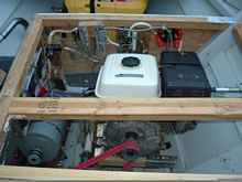 Since I had never used a boat powered by electricity before I decided to play it safe and add a little 8ph air cooled Honda motor. I was using a V-belt so it was easy to rig the gas motor next to the electric one and transfer the belts as needed. There is enough room in the dory to put the two side by side.