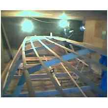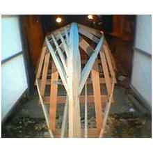 I began construction in May 2010 with the construction of each frame which was drawn out on a 3.6 meter by 1.8 meter sheet of flooring particle board. Each frame was then made by cutting each piece of timber placing it on the outline of the drawn frame on the board and cutting plywood gussets for the chines and Keel line to hold it all together. There are nine permanent frames in all.