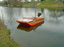 #2 was a lightweight at a finished weight of about 45 lb. With its thin lauan covering over foam, it appeared to be heavily built, and spectators at the ramps were often amazed to see me launch it by tossing it several feet into the water. |