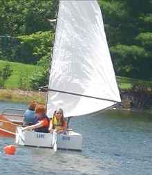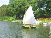 John takes his completed John Duck for a sail on Lake Vista. John was a state cop and ex-military, so he built his boat like a tank and chose a lug sail to power it. |