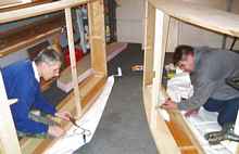 John Nystrom and Andy Cougill, a couple of new boat buddies from Peru, IN, work on their PDRacers in my garage. I cut parts and served as their mentor for assembly. |