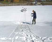 John and Andy got snowed in and spent the night. The next day, we decided to test Lame Duck as a sled. We rigged a safety line in case the ice was too thin. |