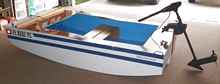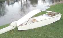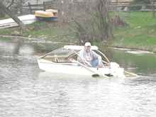 Webfoot  was made of Styrofoam and 2mm marine plywood. Even the seat and its supports were mostly foam covered with thin plywood. In this photo, the foam sides are temporarily attached.