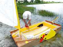 Preparing for launch. I had to borrow the rudder from the Z-PDR to test sail Dangerous Duck. The duck leeboard worked surprisingly well, but it’s mostly for show.  She might have some surprises.