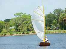 I’m not exactly sure what to call this sail. It looks like a batwing up top but it has a sprit boom below. It needs tweaking, but I think it will make a good light air sail.