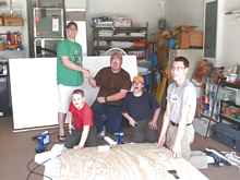 My son Ryan dropped over just in time to help nail the bottom on. Here he congratulates Roger and the boys-- David, Samuel, and Jessie--on their progress.